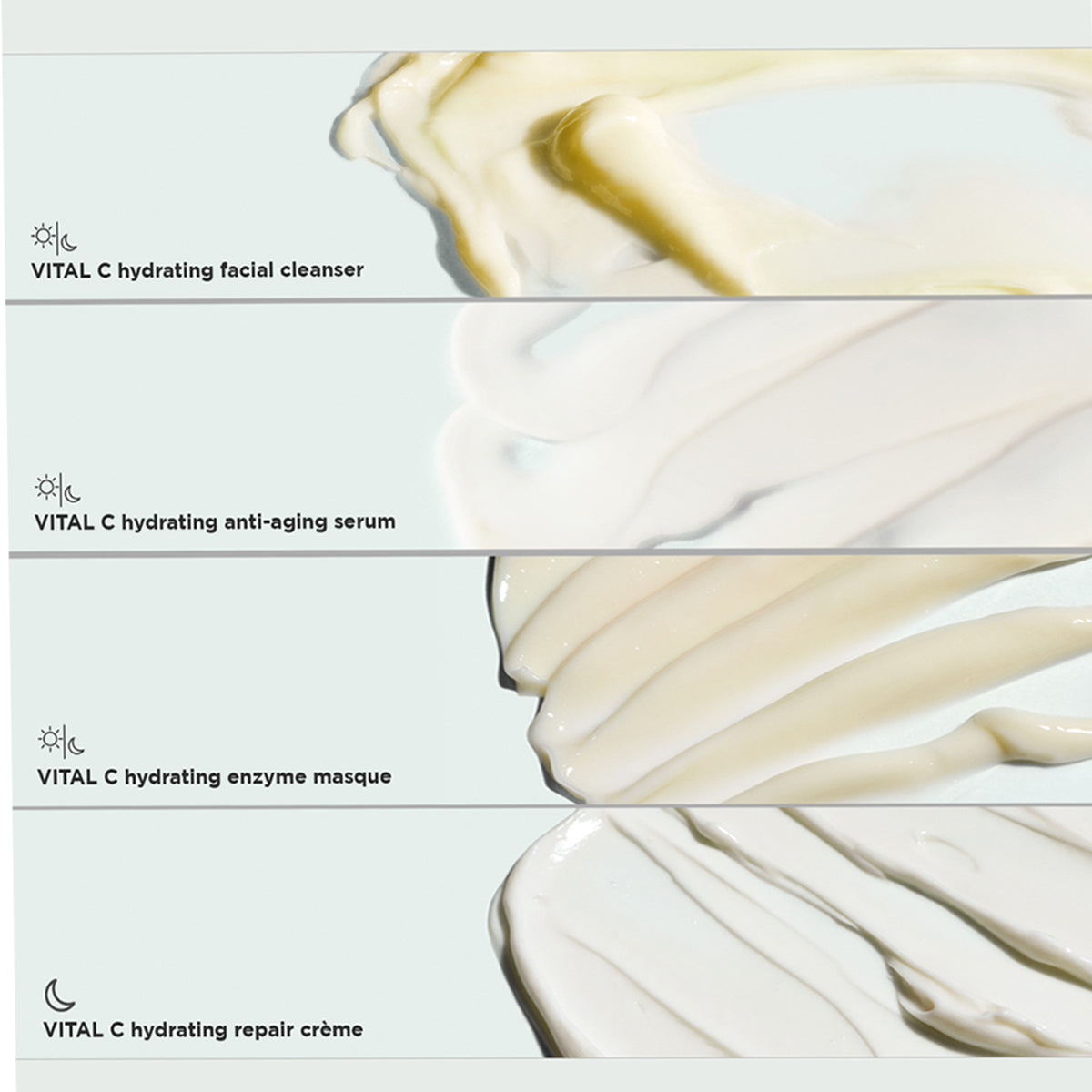 Enthalten sind 4 Tuben à 7,4 ml/7 g: VITAL C hydrating facial cleanser, VITAL C hydrating anti-aging serum, VITAL C hydrating enzyme masque, VITAL C hydrating repair crème.