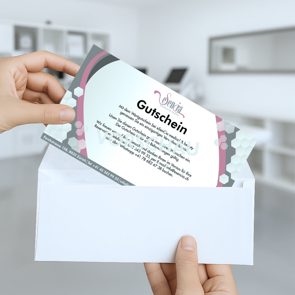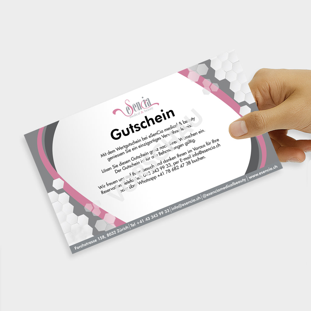 Die Gutscheine von eSenCia sind Geschenkkarten, die ausschliesslich in unserem Studio eingelöst werden können und für alle Schönheitsbehandlungen gültig sind – sowohl klassische als auch apparative Anwendungen.